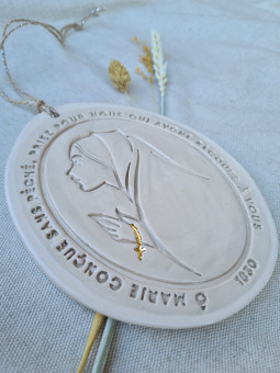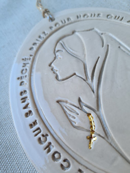 Les médailles de berceau sont faites en faïence blanche. Nous travaillons « à la plaque » avant de les faire cuire trois fois. D’abord pour cuire « le biscuit » à 1000°C pendant 24h puis nous les émaillons et les faisons cuire une deuxième fois à 1000°C pendant 24h. Ensuite, nous les dorons à...