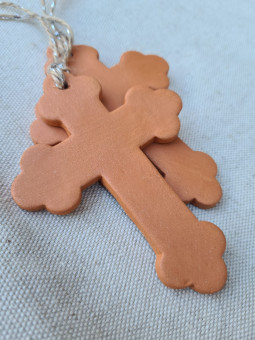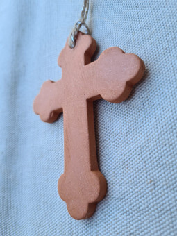 Les croix et colombes sont faites en faïence rouge de Provence : terre de très belle qualité. Nous travaillons « à la plaque » avant de les faire cuire à 1000° pendant 24h.