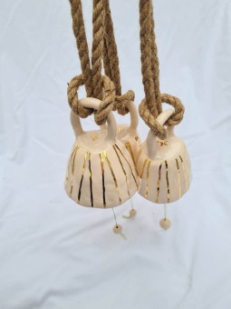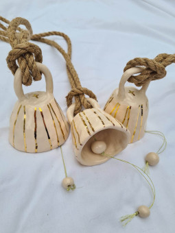 Les cloches sont faites en faïence blanche. Nous les modelons à la main (pas de moule) avant de les faire cuire trois fois. D’abord pour cuire « le biscuit » à 1000°C pendant 24h puis nous les émaillons et les faisons cuire une deuxième fois à 1000°C pendant 24h. Ensuite, nous les dorons à l’or...