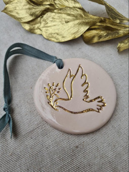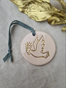 Les colombes sont faites en faïence blanche. Nous travaillons « à la plaque » avant de les faire cuire trois fois. D’abord pour cuire « le biscuit peint » à 1000°C pendant 24h puis nous les émaillons et les faisons cuire une deuxième fois à 1000°C pendant 24h. Ensuite, nous les dorons à l’or fin...