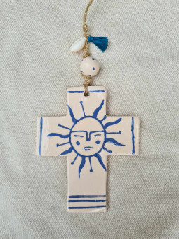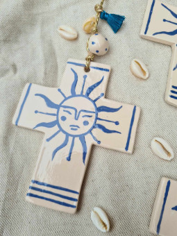 Les croix sont faites en faïence blanche. Nous travaillons « à la plaque » avant de les faire cuire deux fois. D’abord pour cuire « le biscuit peint » à 1000°C pendant 24h puis nous les émaillons et les faisons cuire une deuxième fois à 1000°C pendant 24h.