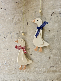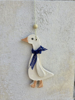 Oie en faïence blanche de Normandie, peinte aux engobes et émaillée. Oie accompagnée d'un petit ruban et d'une perle en bois.