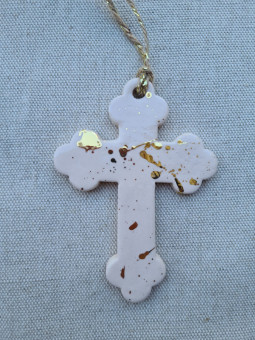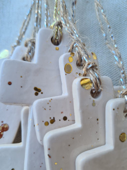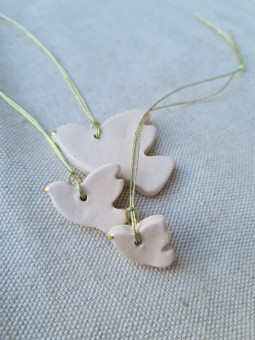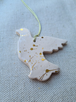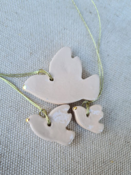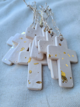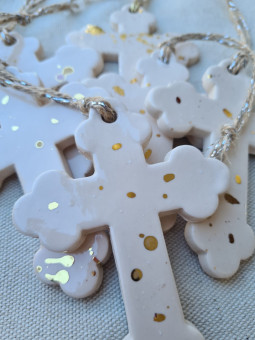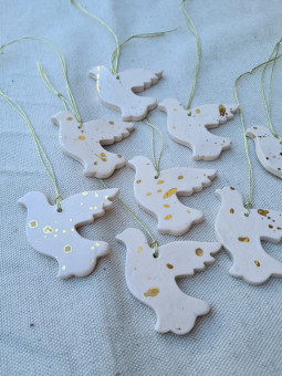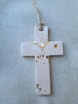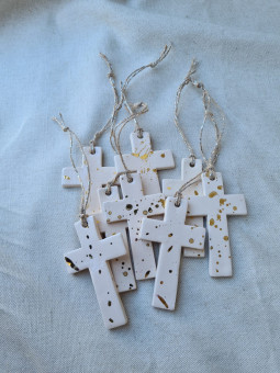 Les croix et colombes sont faites en faïence blanche. Nous travaillons « à la plaque » avant de les faire cuire trois fois. D’abord pour cuire « le biscuit » à 1000°C pendant 24h puis nous les émaillons et les faisons cuire une deuxième fois à 1000°C pendant 24h. Ensuite, nous les dorons à l’or...