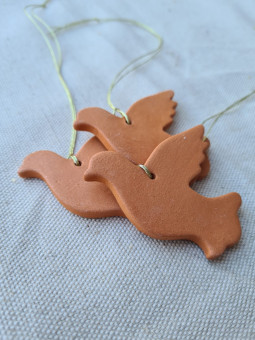 Les croix et colombes sont faites en faïence rouge de Provence : terre de très belle qualité. Nous travaillons « à la plaque » avant de les faire cuire à 1000° pendant 24h.
