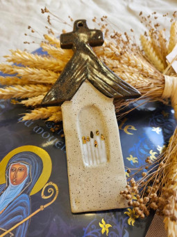 Prix 32,00 €Chapelle modelée à la main en grès pyrité et dorée à l'or fin. 3 cuissons à haut température.