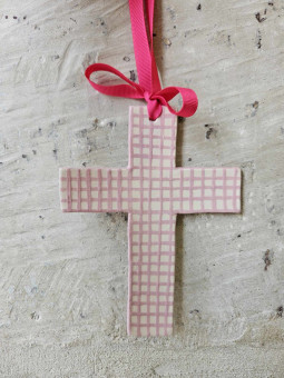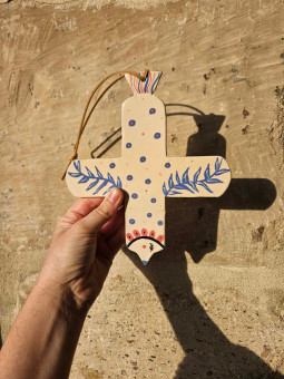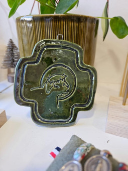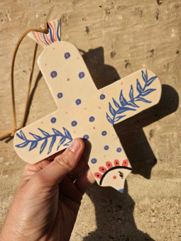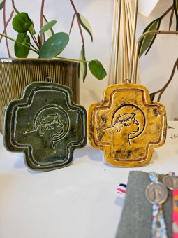 Prix 45,00 €Les croix sont faites en faïence blanche. Nous travaillons « à la plaque » avant de les faire cuire deux fois. D’abord pour cuire « le biscuit peint » à 1000°C pendant 24h puis nous les émaillons et les faisons cuire une deuxième fois à 1000°C pendant 24h.