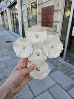 Prix 34,00 €Les croix et colombes sont faites en faïence blanche. Nous travaillons « à la plaque » avant de les faire cuire trois fois. D’abord pour cuire « le biscuit » à 1000°C pendant 24h puis nous les émaillons et les faisons cuire une deuxième fois à 1000°C pendant 24h. Ensuite, nous les dorons à l’or...