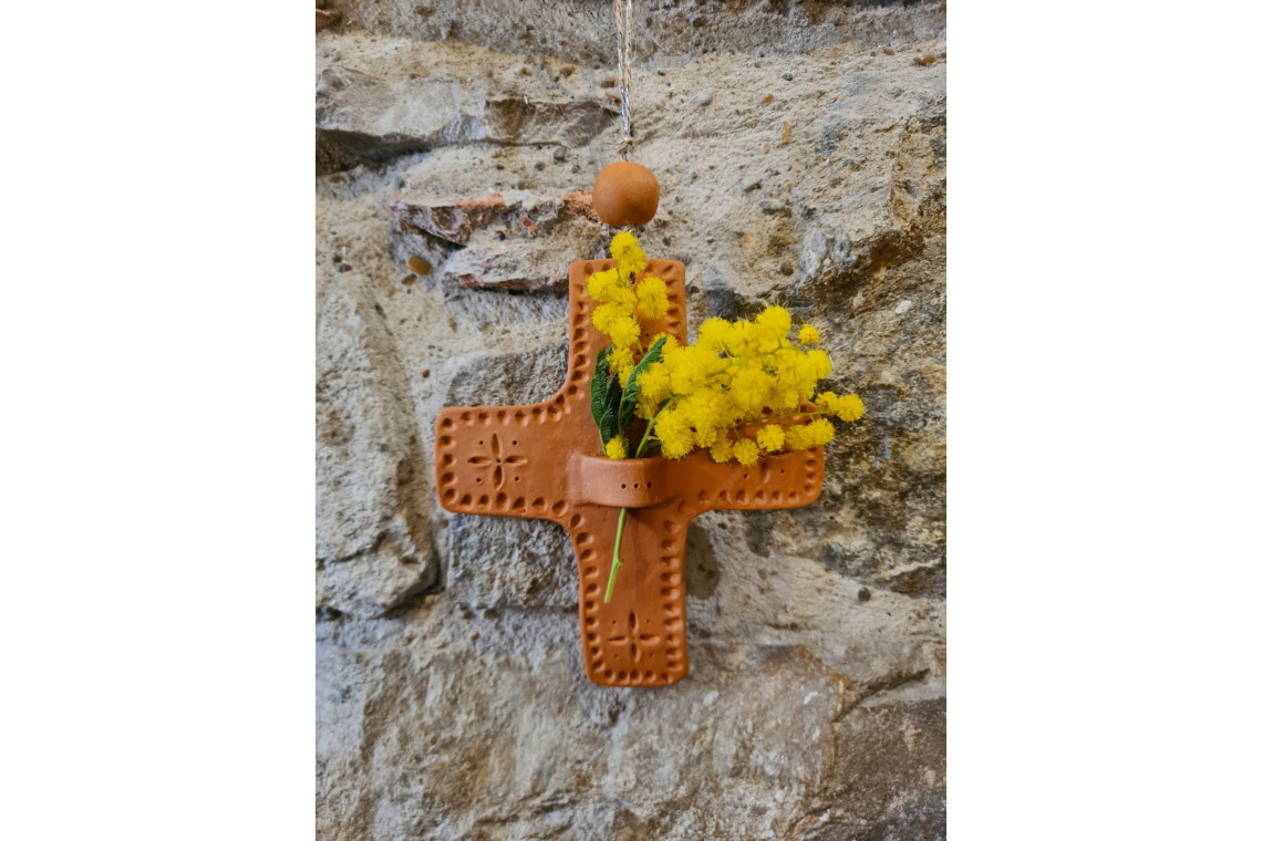 Qui n'a jamais coincé, tant bien que mal, une branche de laurier entre La Croix et le mur après le dimanche des Rameaux et de la Passion ? Les Bigotes les premières ! Elles ont remédié à cela avec La Croix herbier en terre rouge de Provence. La croix contient une petite anse dans laquelle vous pourrez glisser une branche de laurier, un petit bouquet de fleurs séchées ou encore une fleur fraîchement cueillie.