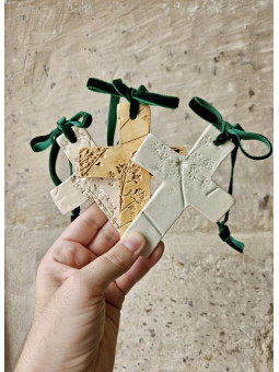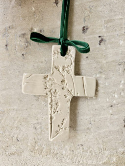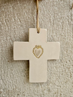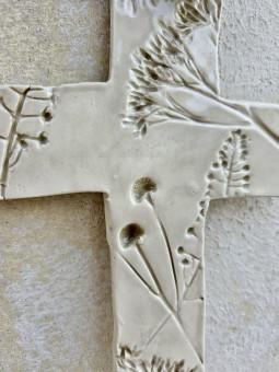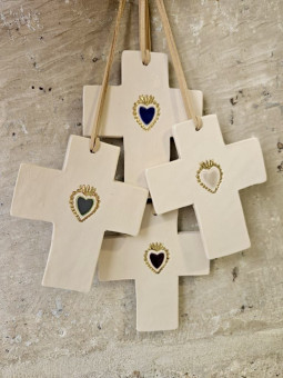 Les croix et colombes sont faites en faïence blanche. Nous travaillons « à la plaque » avant de les faire cuire trois fois. D’abord pour cuire « le biscuit » à 1000°C pendant 24h puis nous les émaillons et les faisons cuire une deuxième fois à 1000°C pendant 24h. Ensuite, nous les dorons à l’or...