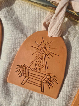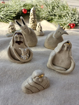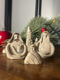 Prix 14,00 €Crèche entièrement modelée à la main en grès pyrité, peinte aux engobes, émaillée et rehaussée d'or et de platine.