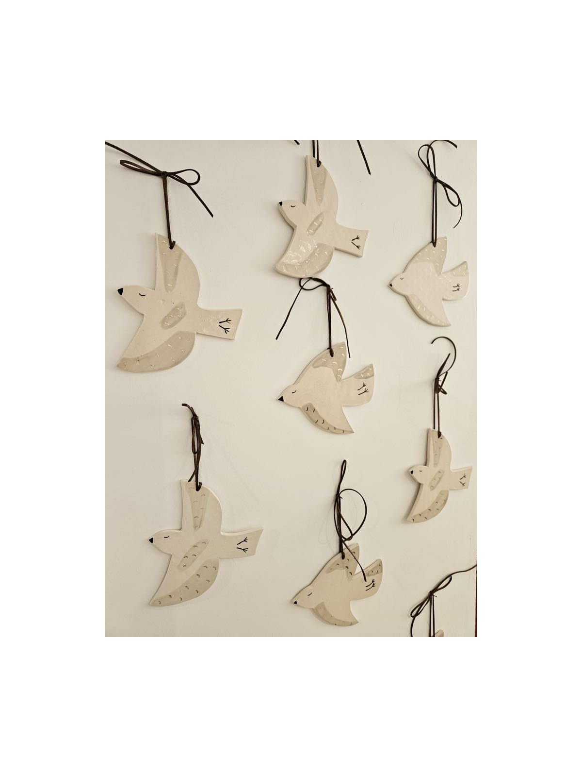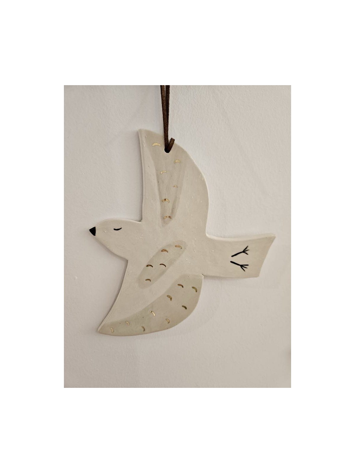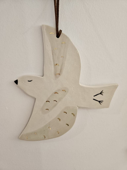 Colombe modelée en faïence blanche de Normandie. Ses pattes, son bec et ses yeux sont peints aux engobes noirs. La pièce est ensuite émaillée en beige et transparent, puis dorée à l'or fin. La colombe est accompagnée d'un ruban en suédine bronze pailleté.
