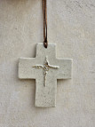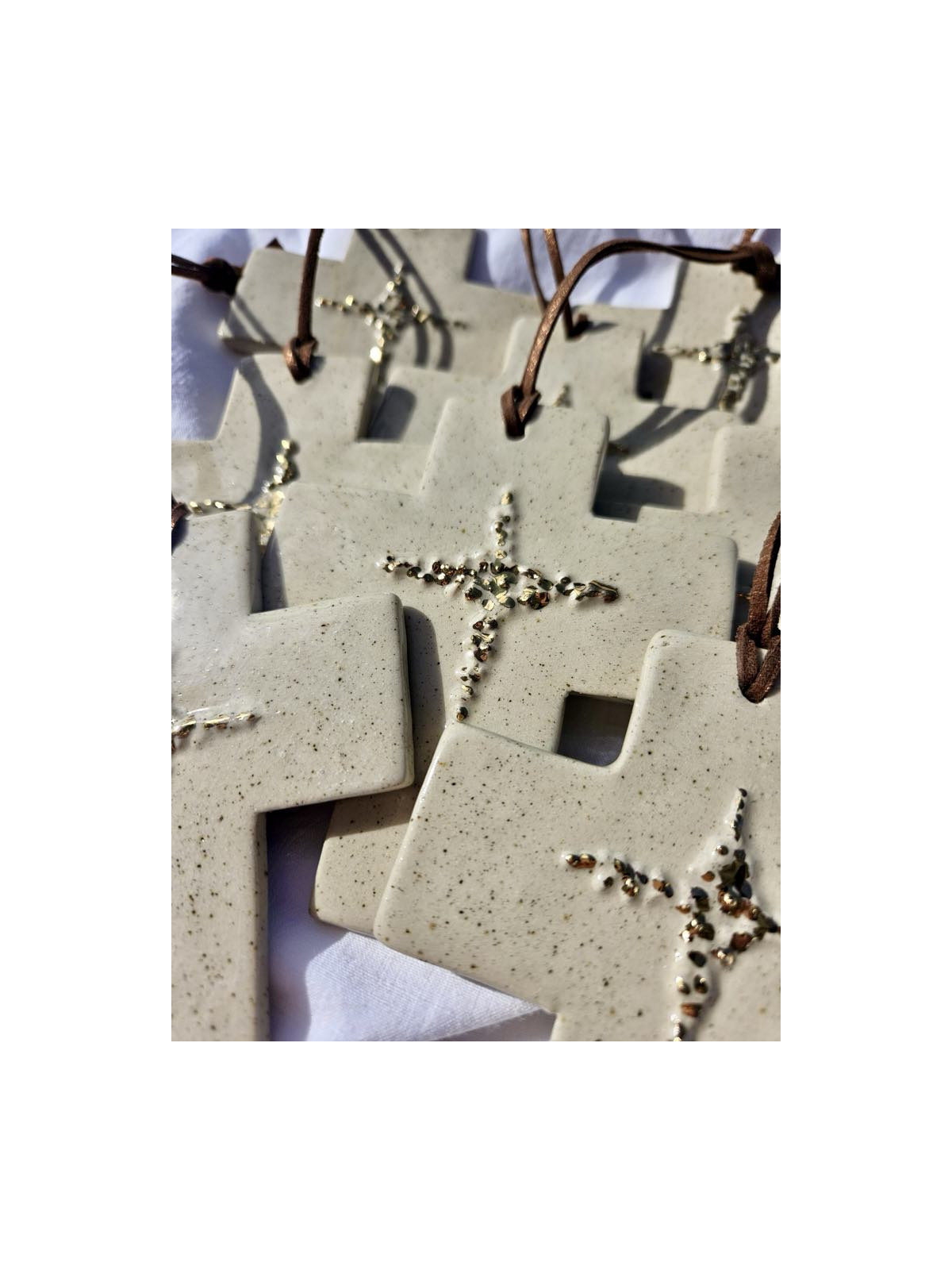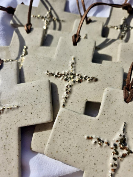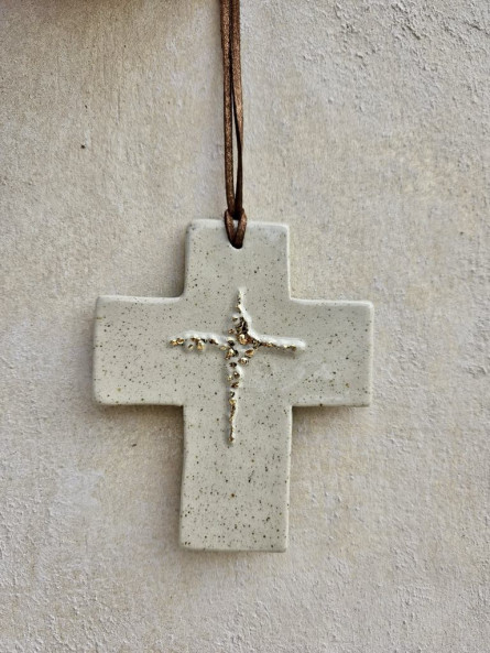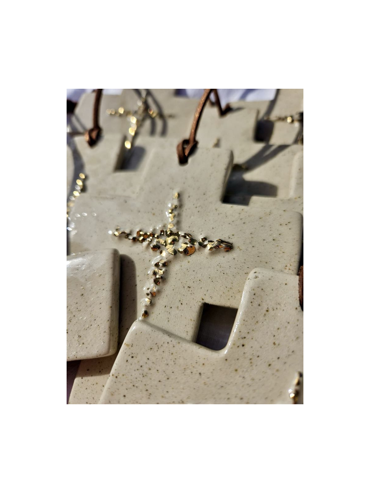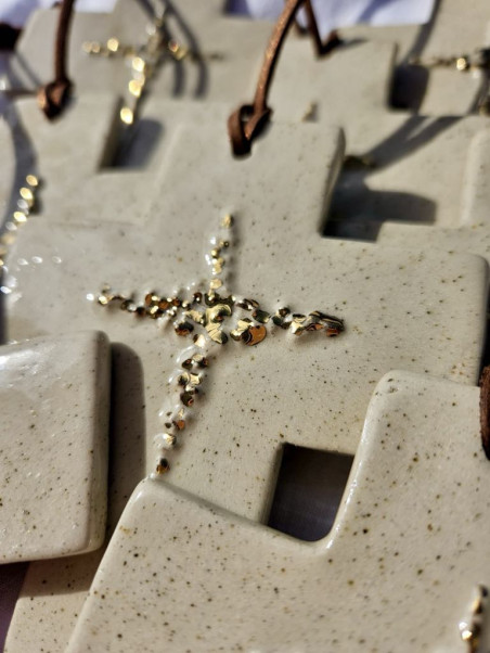 Certainement la plus chic de nos croix ! Elle est modelée en grès pyrité, émaillée et dorée à l'or fin. Le centre de la Croix est fait avec de la barbotine pour former des perles dorées. La Croix est accompagnée d'un ruban bronze pailleté.