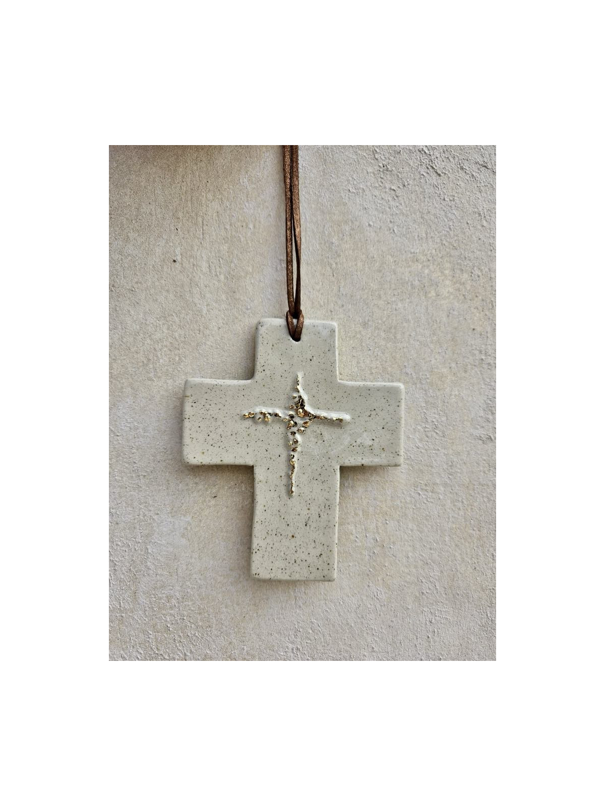Croix en grès pyrité, émaillée et perles dorées à l'or fin.