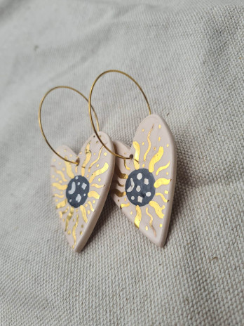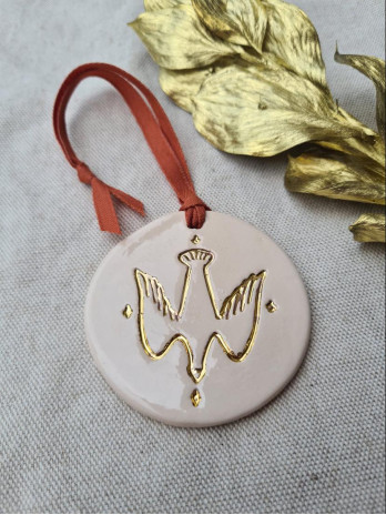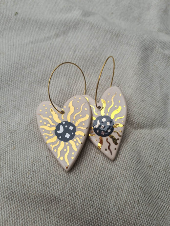 Les pièces sont faites en faïence blanche. Nous travaillons « à la plaque » avant de les faire cuire trois fois. D’abord pour cuire « le biscuit peint » à 1000°C pendant 24h puis nous les émaillons et les faisons cuire une deuxième fois à 1000°C pendant 24h. Ensuite, nous les dorons à l’or fin pour une dernière cuisson à 780°C pendant 24h.