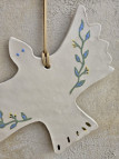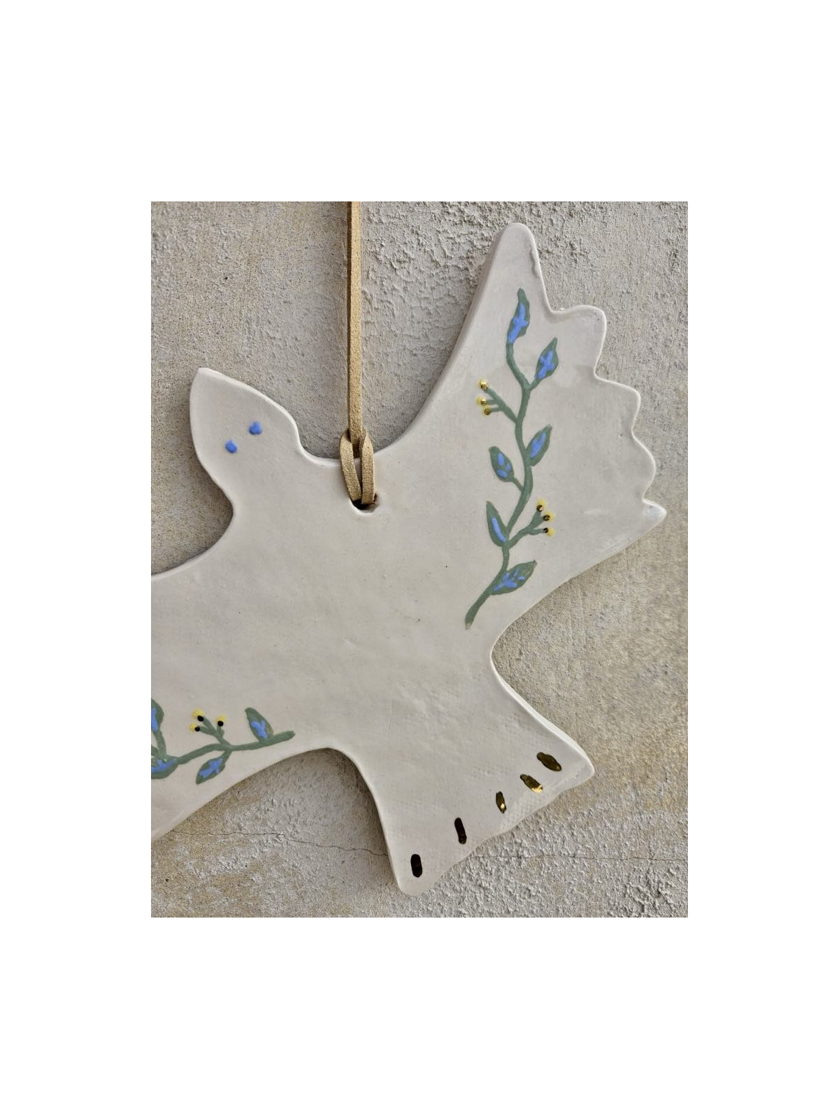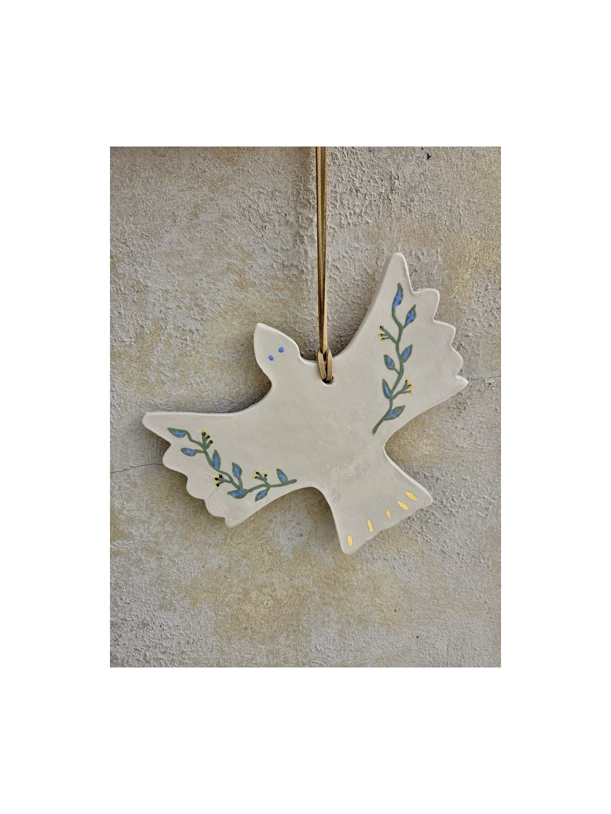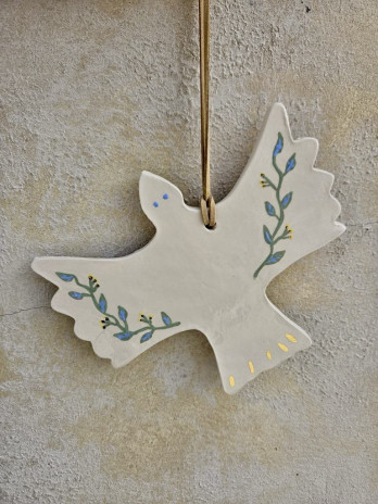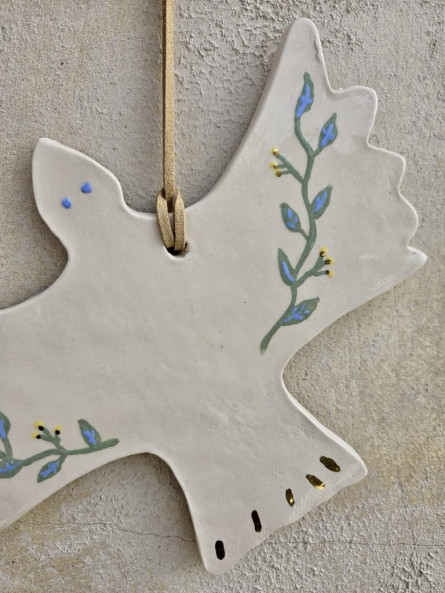 Colombe modelée à la main en faïence blanche, émaillée et dorée à l'or fin. Nous avons imaginé cette colombe poétique avec des couleurs douces.