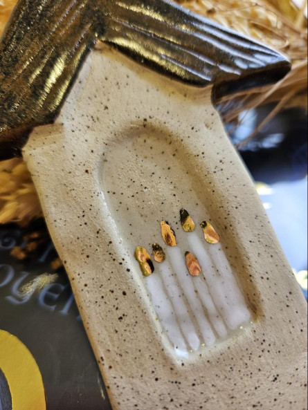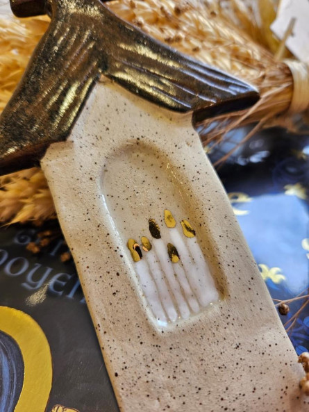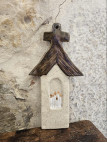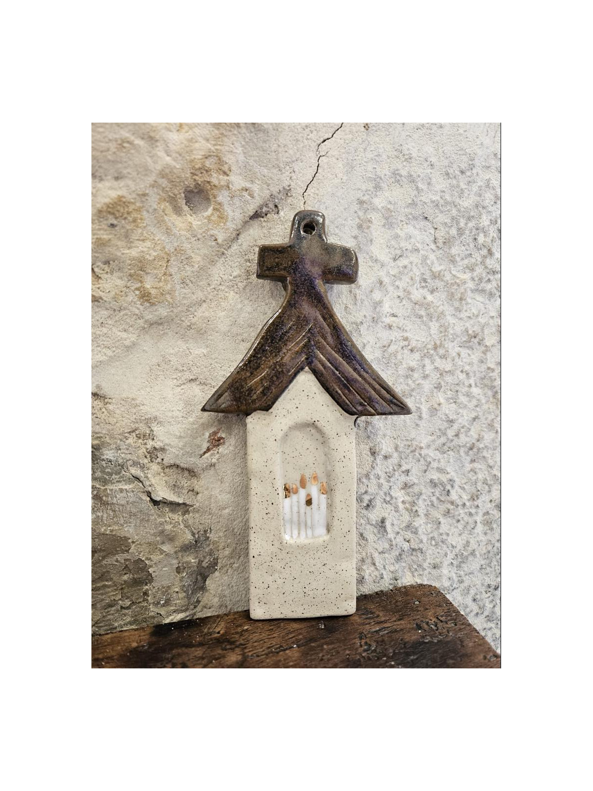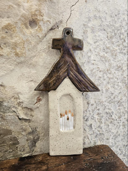 Elle a un charme fou !! Il a fallu beaucoup d'essais pour arriver à trouver l'émail que nous avions en tête pour créer le toit de la chapelle ! Il est lumineux et avec de très beaux sous tons bruns ! Les murs de la chapelle sont laissés bruts pour se rapprocher d'un effet pierres. Seule la fenêtre est émaillée pour laisser transparaître les cierges allumés. La flamme des cierges est dorée à l'or fin.