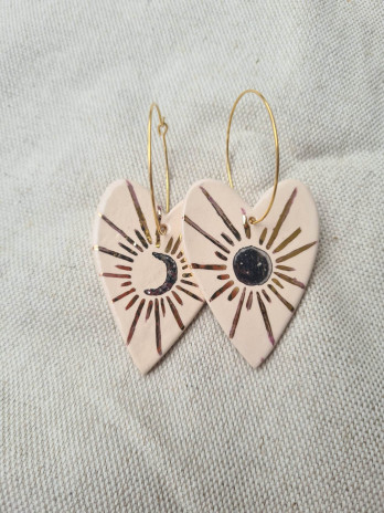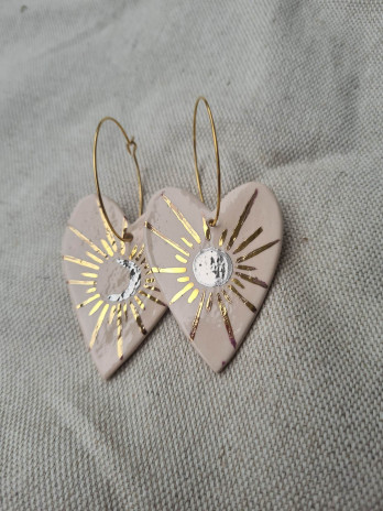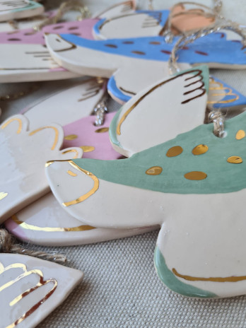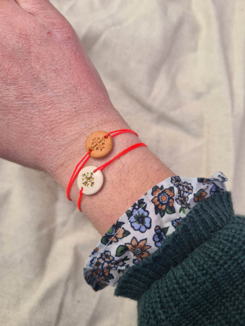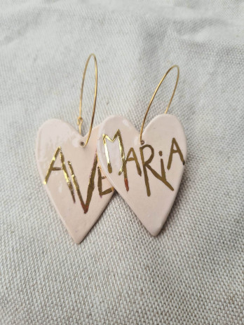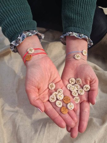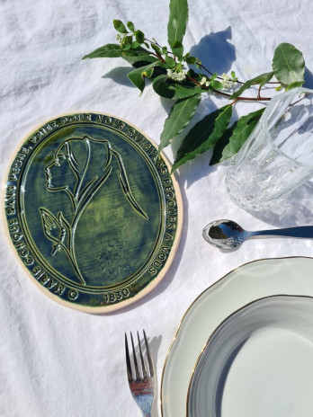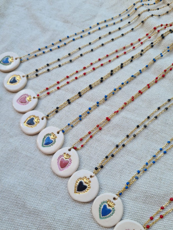 La Rosary Stone est faite en grès pyrité français. C’est une terre de couleur beige. Les perles du dizainier sont également en grès et sont peintes aux engobes. La pièce est ensuite émaillée avec une couverte transparente et brillante et la croix est réhaussée d’or fin.
